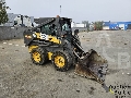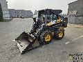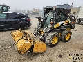 Skid steer loader with loading bucket and broom in working condition.