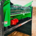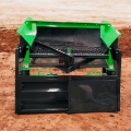Vibrating soil screener equipped with two screening decks. The upper screen has a mesh size of 40x40 mm, while the lower screen is finer at 20x20 mm.